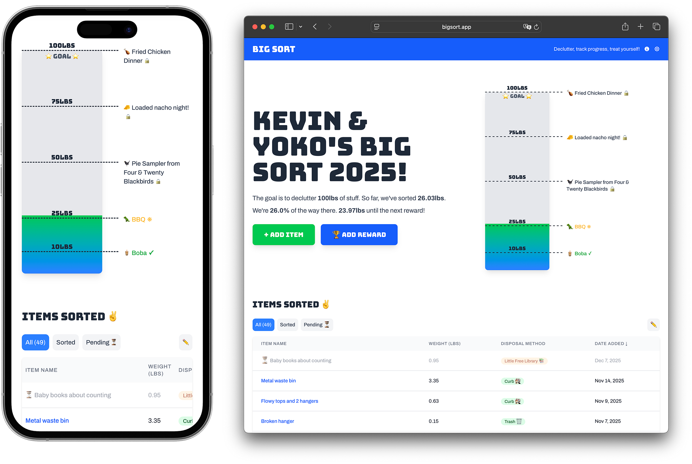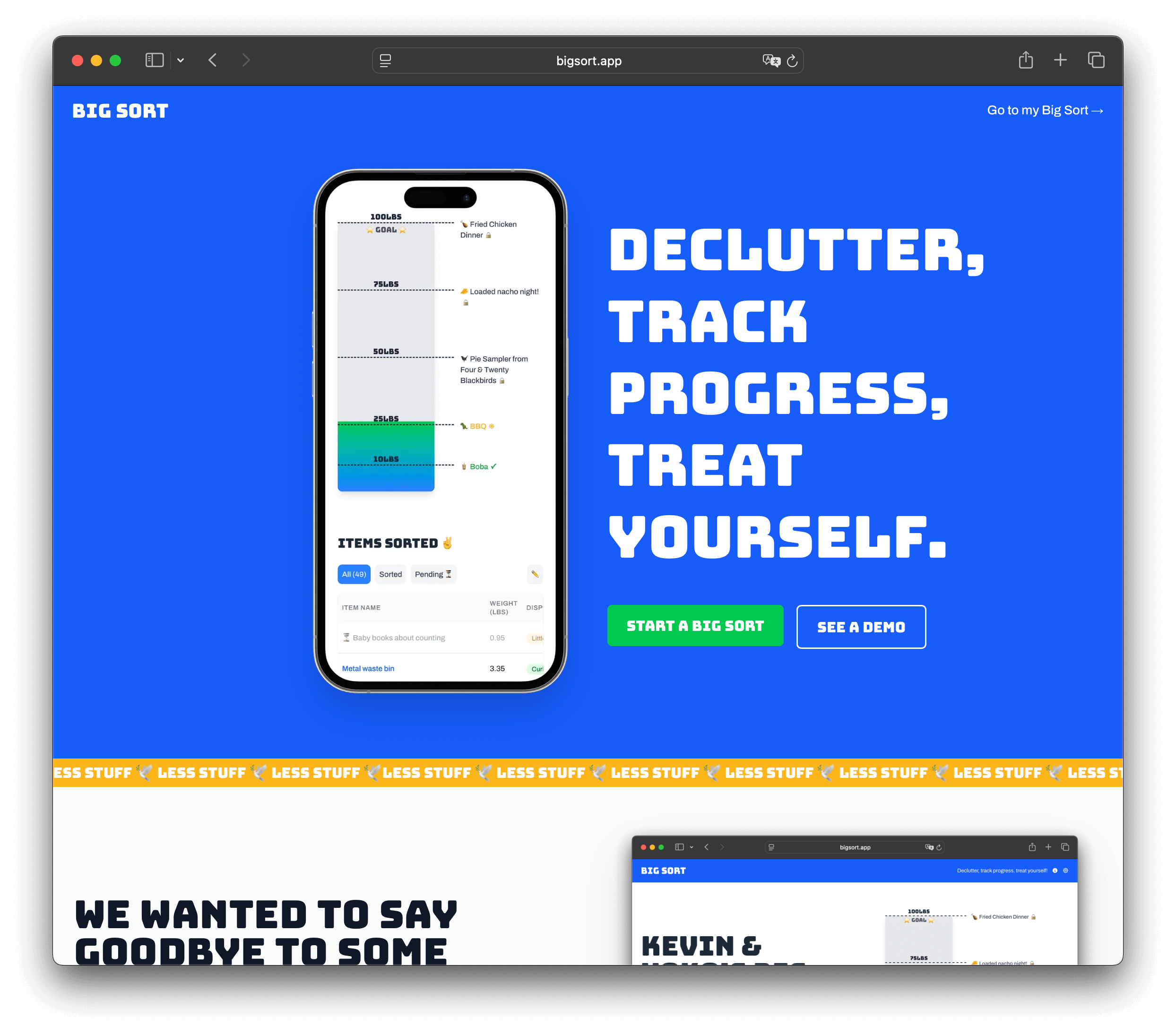 Big Sort is a slightly absurd personal project to not only track our family’s home reset but also get acquainted with different parts of web app development—from choosing a tech stack to managing user accounts.