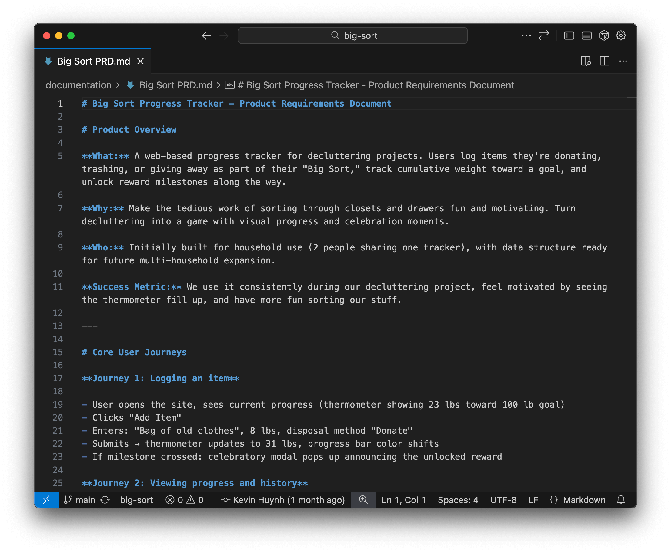 It also defines the core elements of Big Sort (like items, weights, milestones, users) and what data we store in tables. This upfront back-and-forth helped me get clearer on what I wanted and made the actual building with AI much faster.